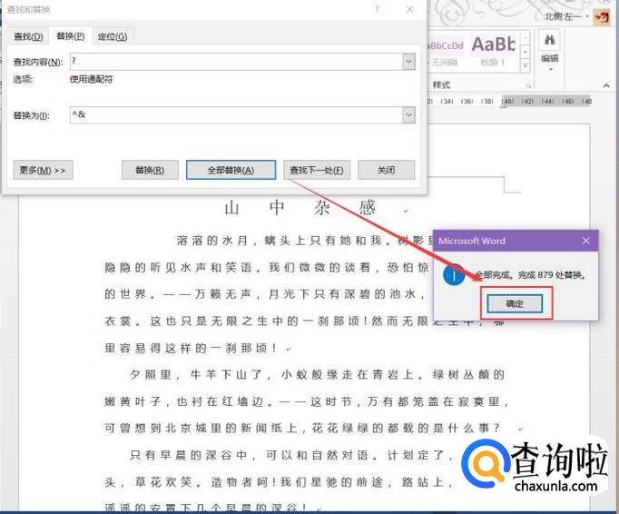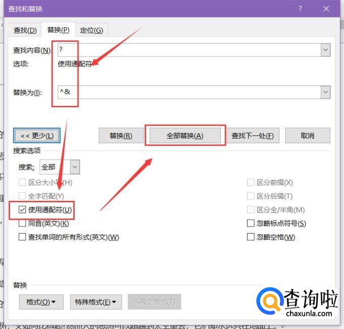 在“查找内容”后面输入“?”,“替换为”后面输入“^&+空格”,然后点击“更多”,在下面点选“使用通配符”,点击“全部替换”。