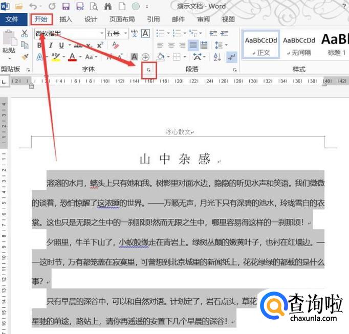 切换到“开始”选项卡,点击“字体”区域右下角的“对话框启动器”。