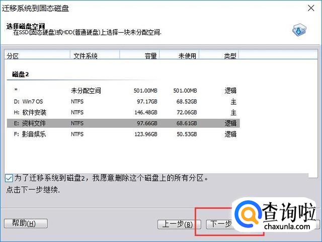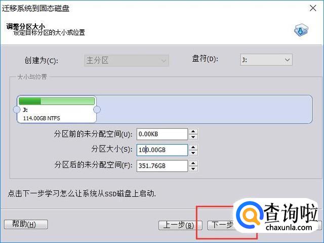 接下来,在固态硬盘中选择尚未分配的空间,然后点击“下一步”按钮。
