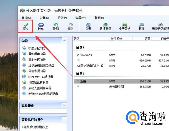 最后,点击软件主页面左上方“提交”按钮,软件即可自动执行系统迁移到固态硬盘的操作。