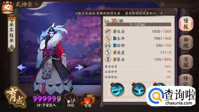 首先我们来看式神的面板属性如何,荒创之主的面板属性中暴击攻击以及速度都是S,但在SSR式神中输出式神这三项基本上都是S相差不大,重点是荒川之主的防御和生命都是B,这就意味着荒川之主不是脆皮式神,要肉一些,其他的SSR这两项为C的很多。