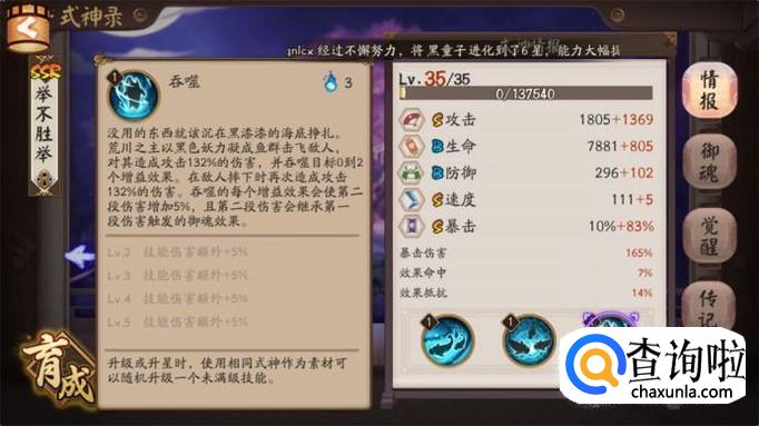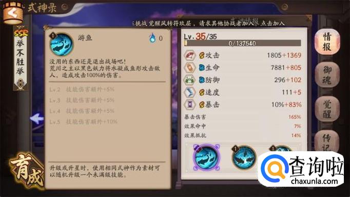 斗技场才是提现式神能力的地方,荒川因为可以打肉队所以很受欢迎,但是能不能吞椒图的连线还是一个人品问题,要是人品不好那就不太给力了。所以玩荒川之主人品真的很重要。