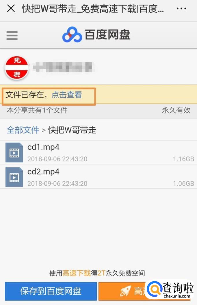 保存成功之后,就会在界面上方看到“文件已存在,点击查看”,点击蓝字就可以在百度云里看到保存好的资源了。