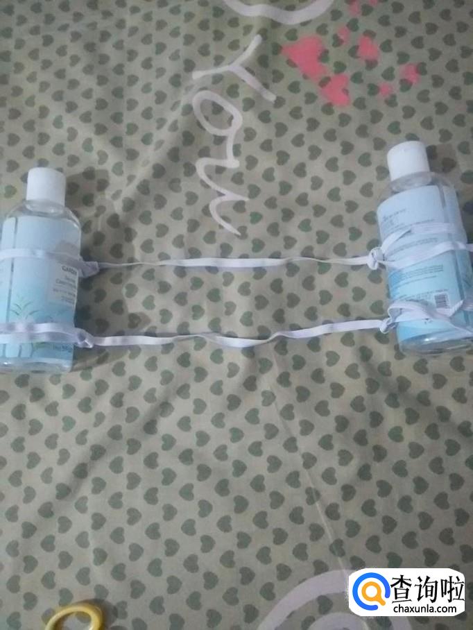 留出同样长度的一段松紧带,再从第一个瓶子的下方打一个结,然后用剪刀剪断,两个瓶子之间的松紧带长度是一样的,这样,双线拉力器就做好了。