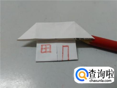 用笔在下面画一个田字,表示窗户,画一个长方形,表示门,小房子就折好了。