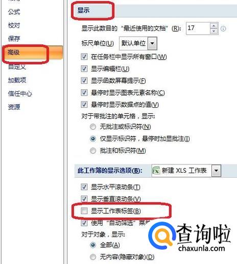 然后在右侧“显示”栏下面,就能看到“显示工作表标签”了,我们把复选框选上,然后点击右下角“确定”,关闭选项面板。