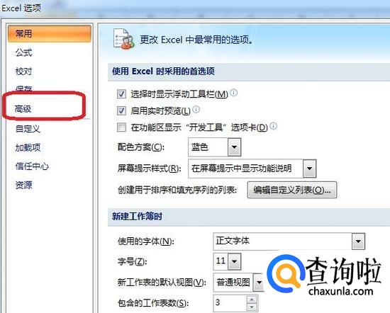 出现“选项”面板后,我们点击左侧栏的“高级”。