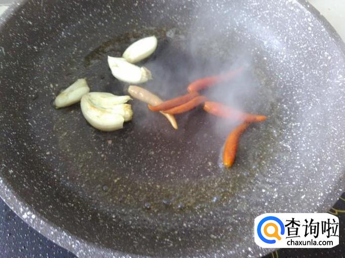 开火下油,放蒜米、小米辣进去爆香。