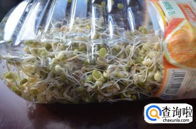 塑料瓶上半部分减掉,瓶身平底可以用锥子钻些小洞,把泡了一晚上的绿豆放入瓶子里,每天用水最少淋两次,放在避光的地方。