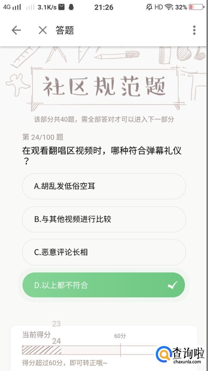 在观看翻唱区视频时,哪种符合弹幕礼仪?