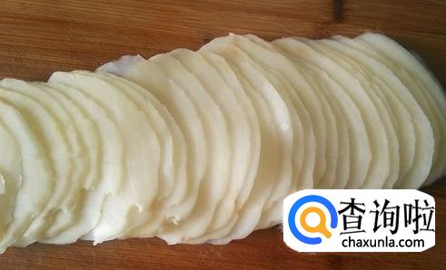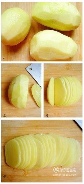先将土豆洗净去皮,准备开切之前,把土豆一头切下一小薄片,这样就可以把这个切出来的平面稳稳的放在菜板上了,下一步就是仔细的,慢慢的,切土豆片,两毫米厚,太薄了也不行。慢是关键,特别是对于新手,下手要有力度,不要犹疑,要不这个片可能切不平。