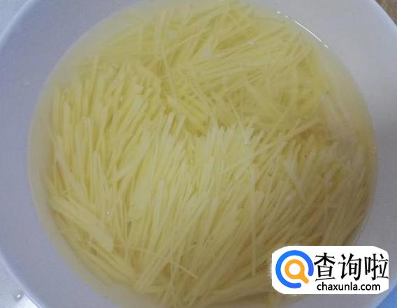 土豆丝切好后,要放到水里泡大概5~10分钟,这样泡出来的土豆丝炒出来口感才脆爽。