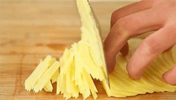 左手压住刚才的理好的土豆片,右手切丝。新手更要慢,两毫米左右一刀。这个可以斜一点向下切,如果是冬天的土豆,会比较硬,直直的切下去很可能有些吃力,导致你一下切不到底,再补刀就比较麻烦。随着你的熟练程度的增加,速度慢慢加快,成就感也就慢慢增加。切丝的时候注意,左手的手指头一定要往里缩,确保不会切到手指甲和手指头第二个关节的皮肤!