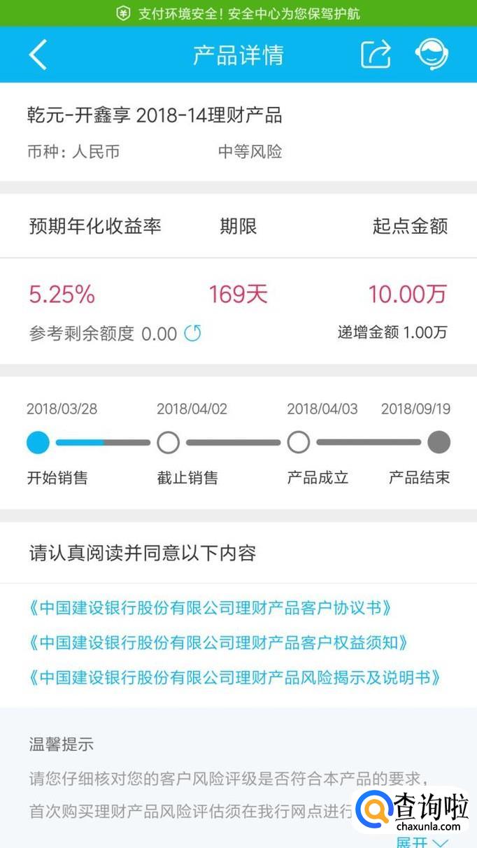第三款理财产品:乾元—开鑫享201814理财产品。起点金额10万,递增金额1万起。期限169天,年化收益5.25%。中等风险。