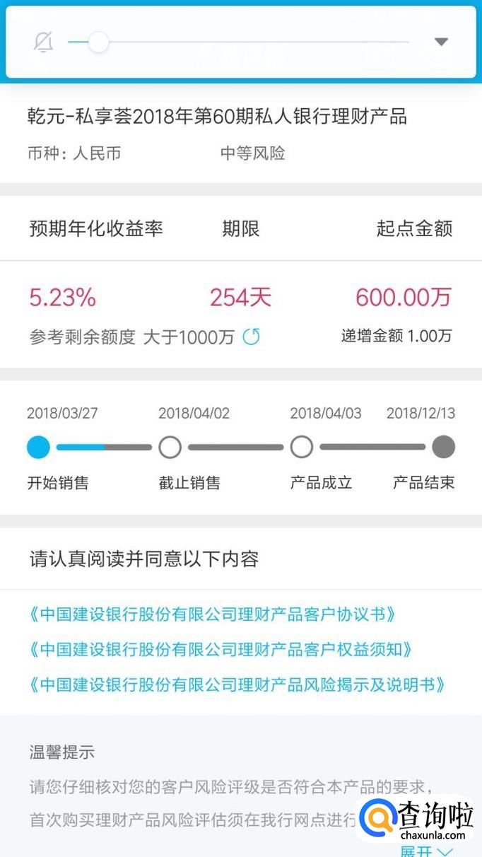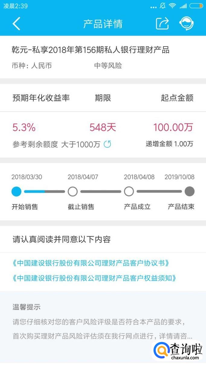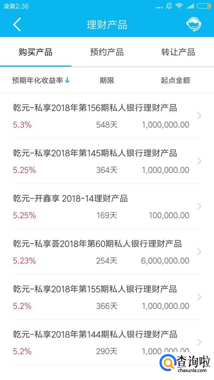 第一款理财产品:乾元—私享2018年第六期第156期私人银行理财产品。起点金额100万,理财时间548天,年利率5.3%。