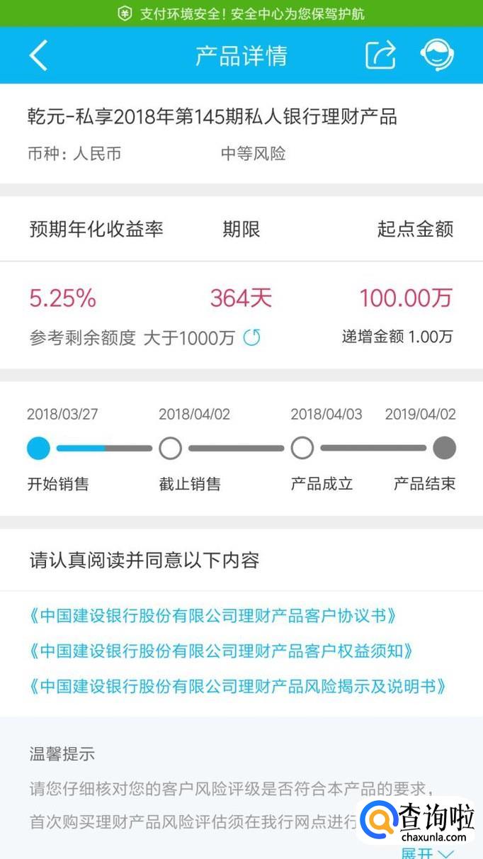 第二款理财产品:乾元—私享2018年第145期私人银行理财产品。起点金额100万,投资期限364天,年化收益5.25%,风险中等。