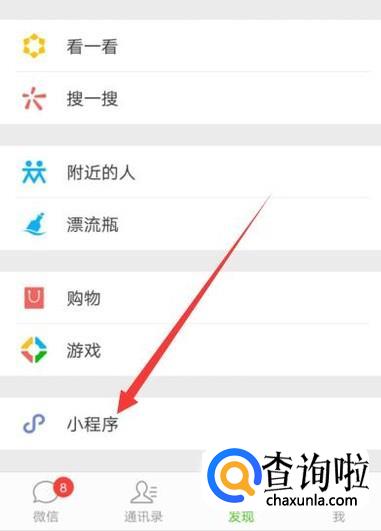 打开微信,进入发现页面,点击“小程序”,如图所示。