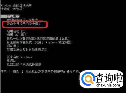 出现如下启动菜单,我们看到有三个版本的安全模式可以选择,键盘方向键可以上下移动光标,我们移到“带命令行提示的安全模式”,按回车键确定。