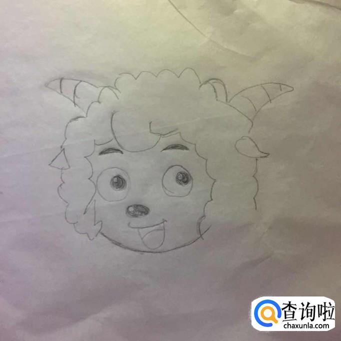 接着画出喜羊羊的眉毛,眼睛,鼻子和嘴巴,如下图所示。画喜羊羊眼睛的时候可以画出三个小圆圈,然后用铅笔在中间圆上涂抹一下就可以了。