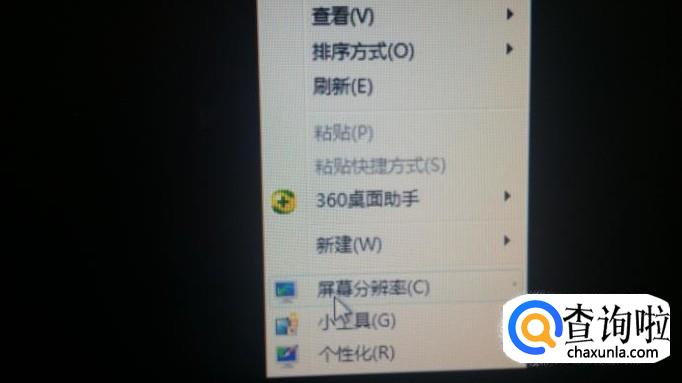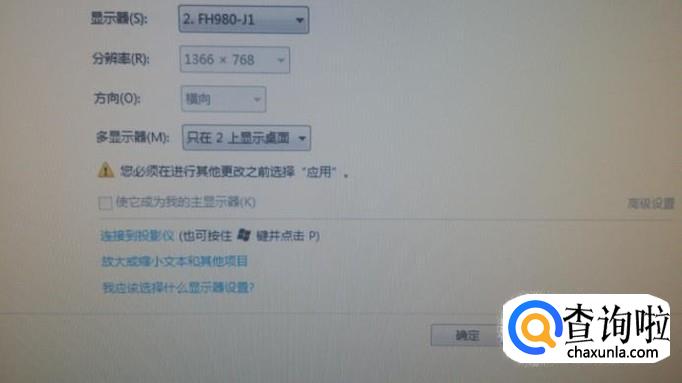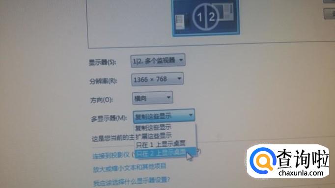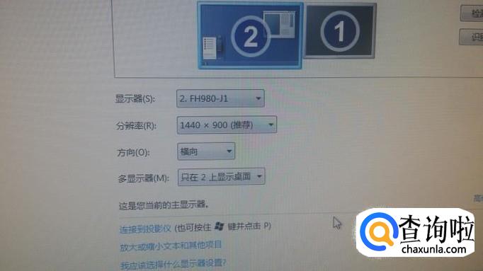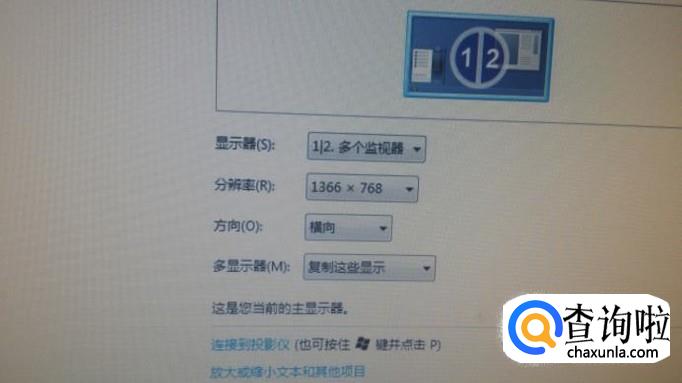 鼠标右键单击屏幕空白处(两个屏显示是一样的),在弹出的菜单中点击“屏幕分辨率”,你会看到两个屏的分辨率都是1366x768,这个是笔记本屏的分辨率,而外接显示器的应该是1440x900才对,但在这里没有更高的分辨率。