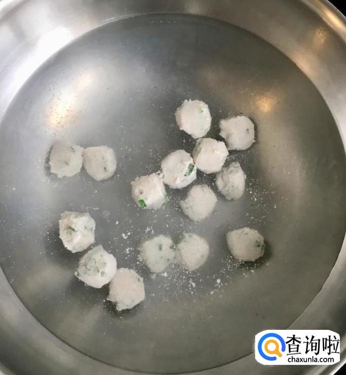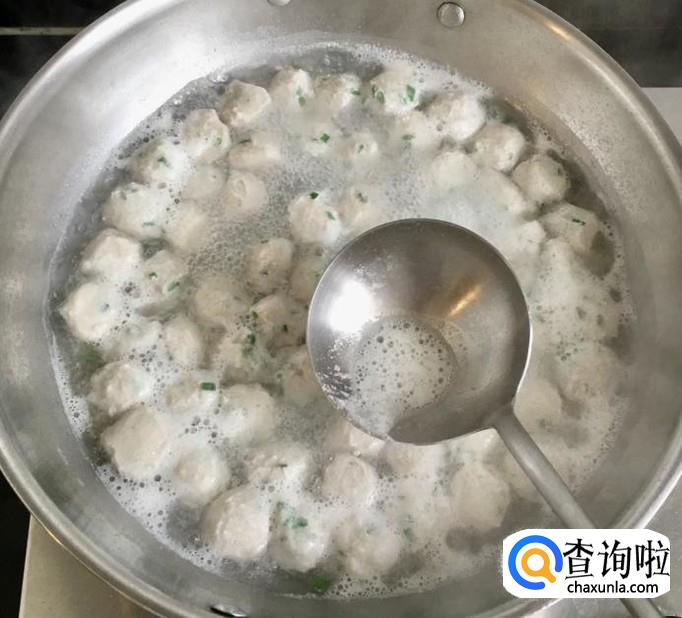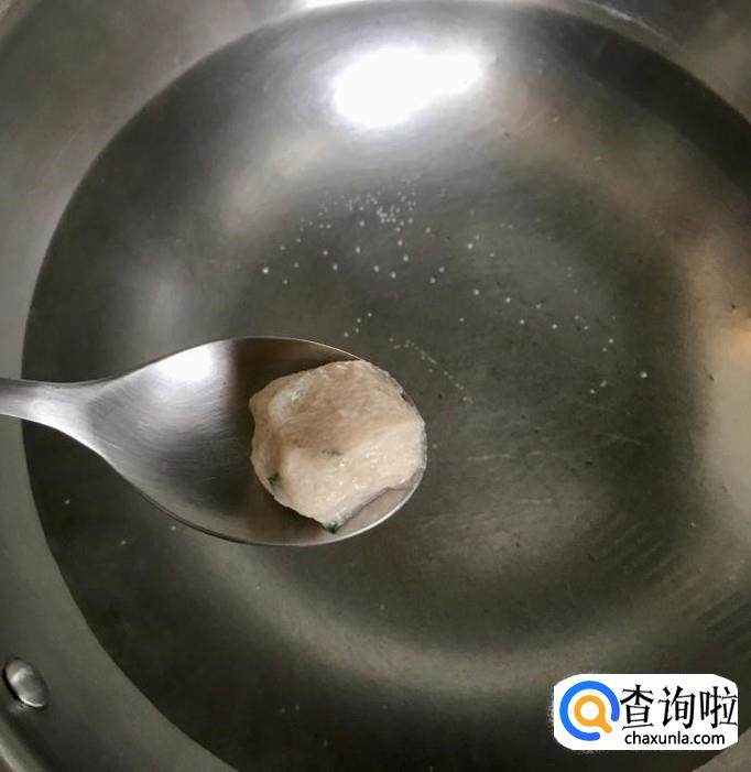 锅中加入适量的清水煮至锅底出现小水泡时改小火,用手握起鱼馅从虎口挤出用小勺挖起放入锅中