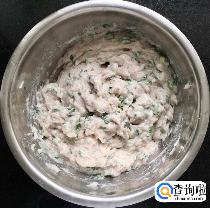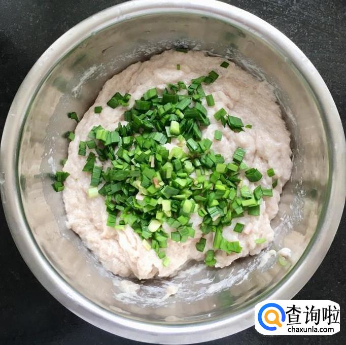 剁好的肉泥放入容器中加入适量的香油、料酒、盐、淀粉、蛋清、葱姜花椒水用筷子顺着一个方向搅拌上劲儿使肉馅吃透水分,切记搅拌时一定要顺着一个方向,水要分多次加入。搅拌好放入冰箱冷藏30分钟后放入韭菜末再次搅拌均匀即可。