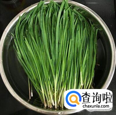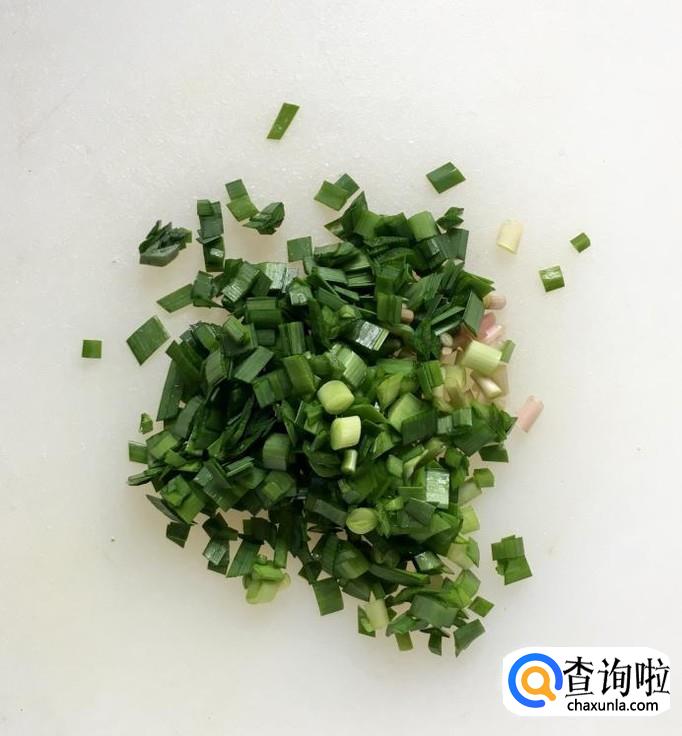 韭菜择去老叶子用水浸泡一会儿反复冲洗干净泥沙,控干水分后切成韭菜末备用