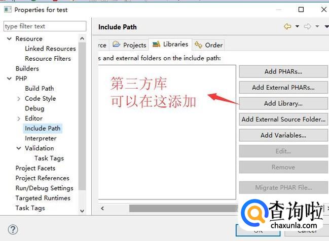 另外在实际的应用中,很可能会用到第三方的类库,这个时候就需要在Include Path里面添加即可,如下图所示