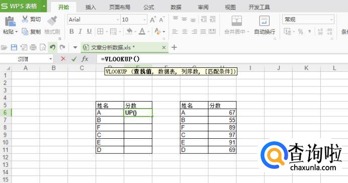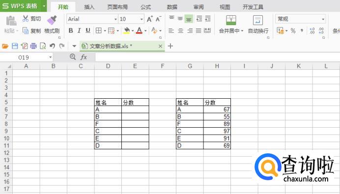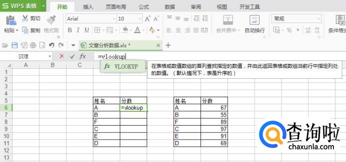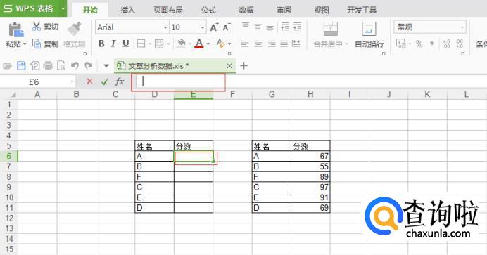 为方便演示,这里小编打开Excel以后,列出来了ABCDEF五个同学的实际,我们需要用vlookup函数,将他们的成绩快速查找到空缺处。