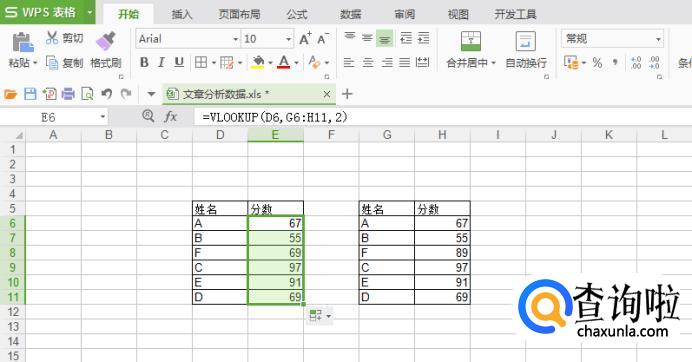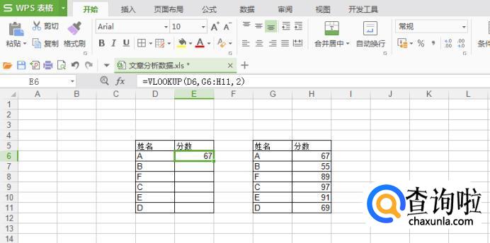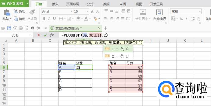 在括号里依次输入,查找值,数据表,列序数。这里我们的查找值是当前选择姓名所在单元格D6,数据表是已有成绩表格G6:H11,位于第2列