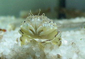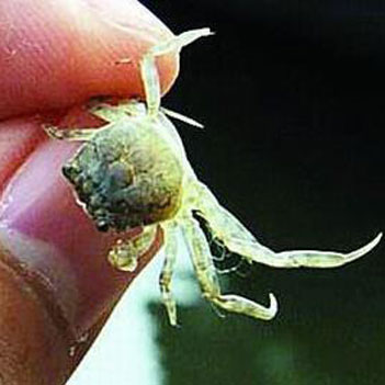 豆蟹是生活在浅海的一类小型螃蟹,大小只有1-2厘米,称得上是螃蟹中的侏儒,是世界上最小的螃蟹,又形似小豆,故称为豆蟹。它们常与水母、海葵、贝类(牡蛎、江瑶、扇贝、贻贝等)和棘皮动物共栖或寄生。豆蟹寄生在贝类,常损害贝类的鳃、外食膜、卵巢、消化腺等,使贝类动物消瘦,影响产量和贝的质量,可以说它们是贝类人工养殖的敌害。然而豆蟹和扇贝倒能配合默契,相互利用,相处的很好。