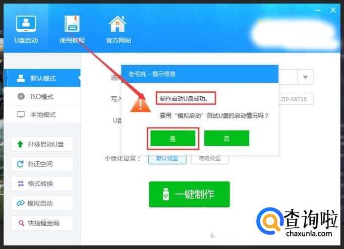 稍等片刻后,U盘启动器就制作成功了,店即将“模拟启动”,查看启动情况。
