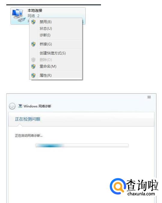 右击相应的网络连接,选择“诊断”;window7系统的诊断功能可以解决大部分网络连接问题: