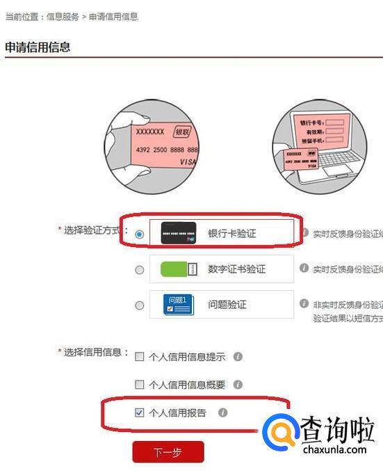 输入用户名和密码登录后,会进入验证环节,我选择“银行卡验证”,并选择申请“个人信用报告”。