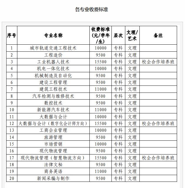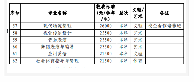 1、学费:学校各专业收费标准严格按对外公示的标准收取,其中本科文理类学费23500/年、艺术类28000/年、校企合作专业27000/年;专科文理类学费16000/年、艺术类18000/年、校企合作专业18500-19500/年。