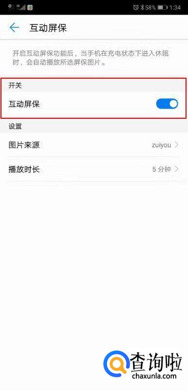 在这里我们可以看见‘互动屏保’这个功能是开启的。