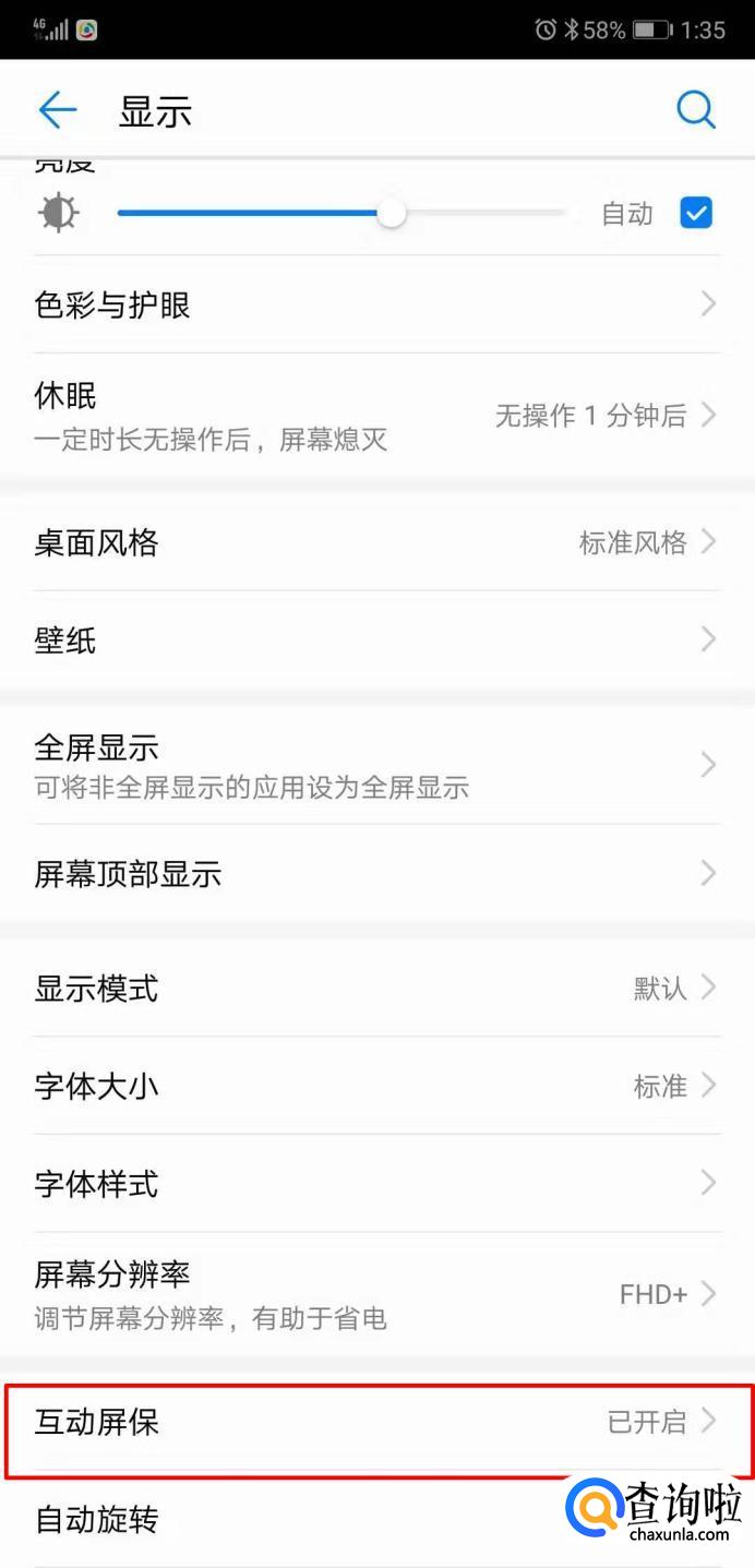 进入显示界面,往下拉选择‘互动屏保‘。