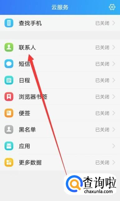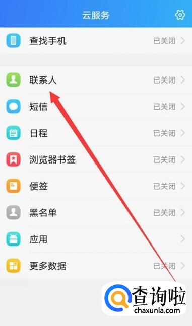 在手机恢复出厂设置之后,登录云服务账户,选择“联系人”,点击并进入,如图所示。