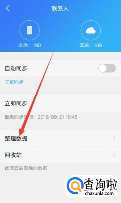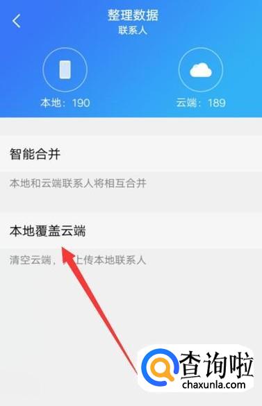 进入之后,点击““本地覆盖云端””,将通讯录备份到云端,如图所示。