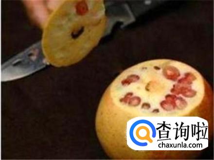 看一下切开两头的石榴,中间是一道道白色的东西,用刀直接竖着切这些位置。