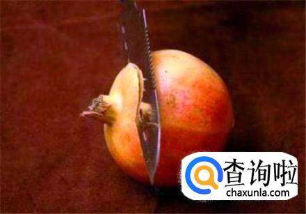拿来一个石榴,用刀子将石榴的嘴巴往下的部位切下来,注意刚刚切到有石榴籽的位置就可以。