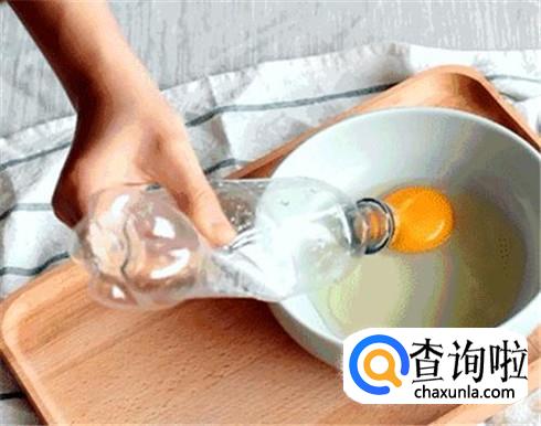 鸡蛋打进碗里面,找一个空的矿泉水瓶子,捏一下瓶子然后把瓶子口对准蛋黄,蛋黄快速进入瓶子内。