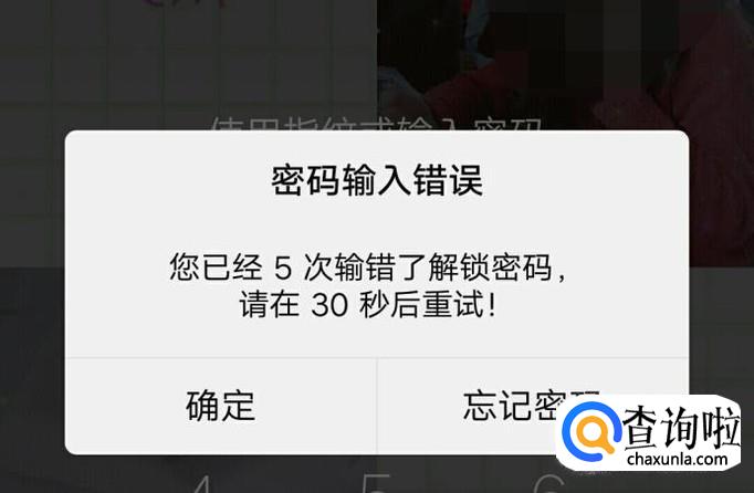 当我们忘记密码锁,可以连续按错五次,五次之后系统会出现如下图的提示。这个时候我们可以点击忘记密码。