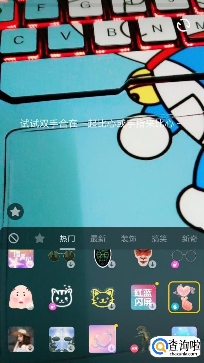 紧接着,我们再点击左下角的道具,并且在热门里面找到并下载比心的特效。