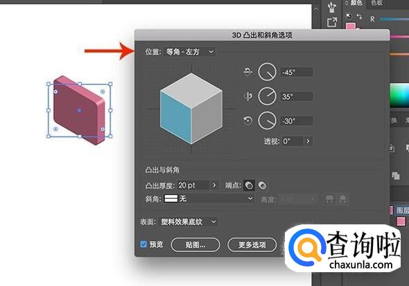 在3D凸出和斜角选项界面,选择一个位置,这个位置确定之后所有的形状都要是这个位置哦,调整厚度之后点击“确定”