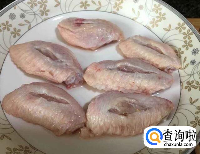 将鸡翅洗干净,放入冷水中烧开,撇去浮沫,捞出晾干。