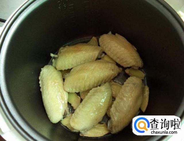 把电饭锅插上电,锅热之后,将鸡翅和腌料一同倒入,两分钟之后将大葱和蒜瓣捡出来。