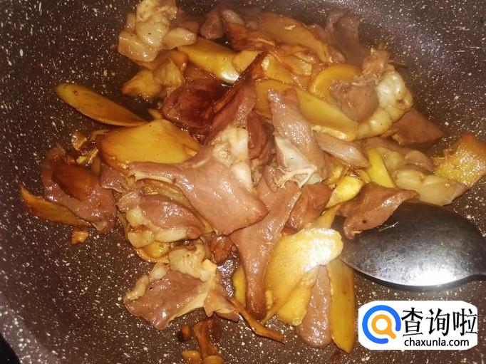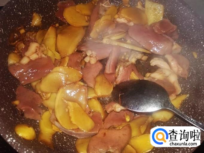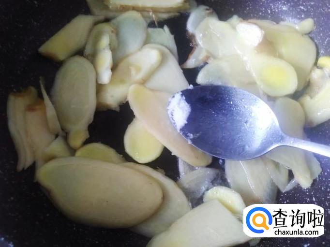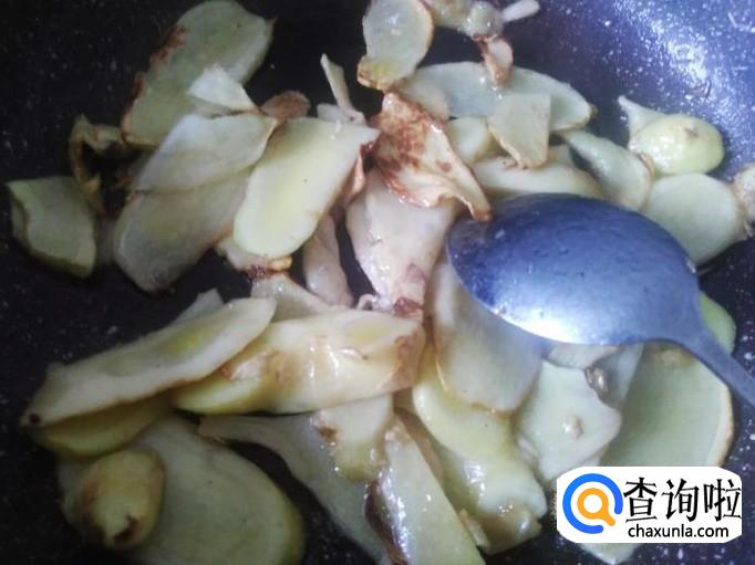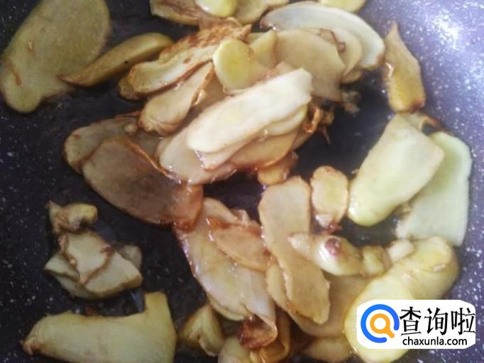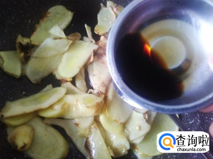 炒到姜片微微变成焦黄色,再加半勺生抽进去翻炒入味。
