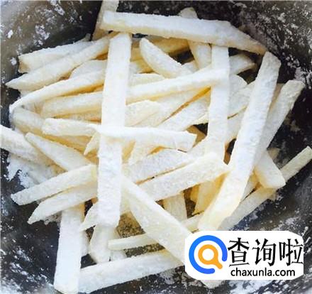 将土豆长条放进面粉里,不断用手揉搓,让面粉均匀的粘到土豆条上。