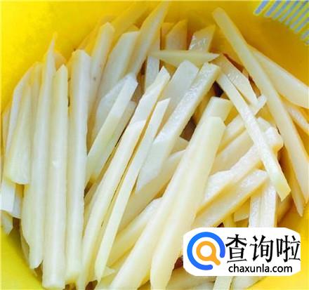 土豆清洗干净,去皮,切成长条,放在淡盐水中浸泡半小时,捞出来控干水分并且晾一下。